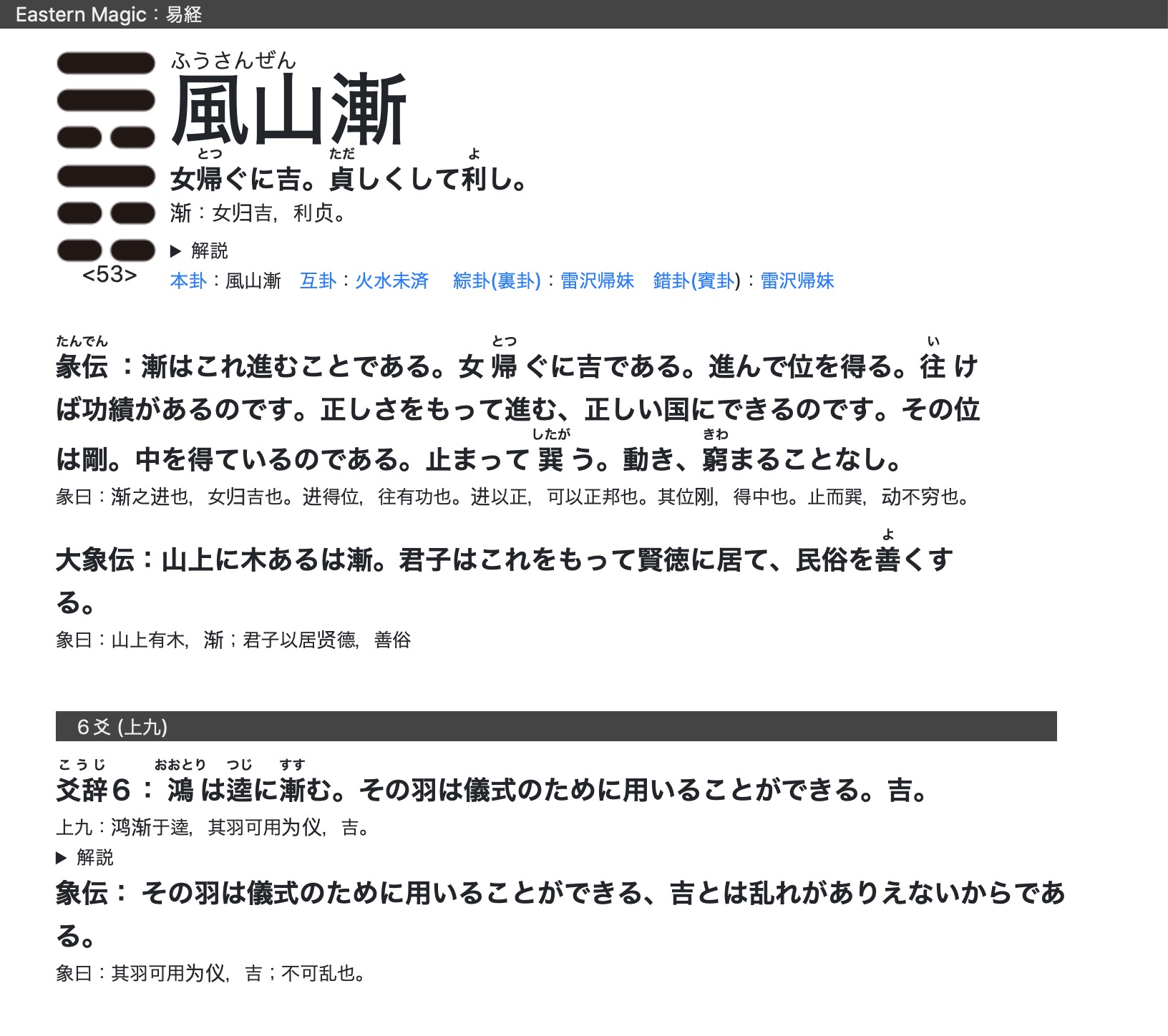 今回得た卦、"風山漸"の名前だけでは意味がわかりませんので、その下の"詳しい説明をみる"黒い丸いボタンを押します。